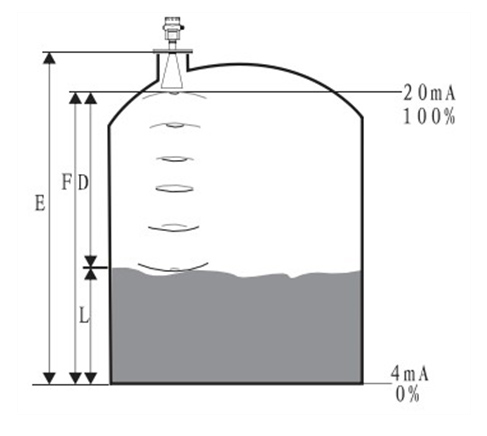 距离物料表面的距离D与脉冲的时间行程T成正比:D=C×T/2其中C为光速因空罐的距离E已知,则物位L为:L=E-D输出通过输入空罐高度E(=零点),满罐高度F(=满量程)及一些应用参数来设定,应用参数将自动使仪表适应测量环境。对应于4-20mA输出。应用介质:智能雷达物位计适用于对液体、浆料及颗粒料的物位进行非接触式连续测量,适用于温度、压力变化大;有惰性气体及挥发存在的场合。